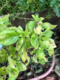 It was with some relief, when Fall arrived, that we gave up all pretense of vegetable growing. We focused instead on our pots of herbs, which did very well for a while, until they didn’t. The basil in particular began sporting round brown spots (never a good sign. I have freckles, so I know). The mint went wild, but then the tarragon did too. They became hopelessly entangled, and it was a vegetarian bloodbath with no survivors.