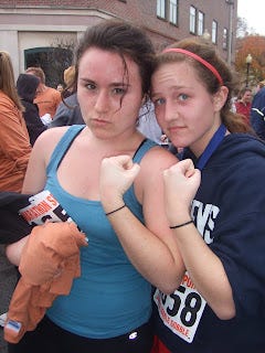 Rose and Julie began by warming up, bending and stretching to beat the band. I had no patience for such a sensible routine, preferring as always to take off from a dead standstill. So for the first 10 or 20 feet, I was definitely in the lead. But then they started to move. I picked up my pace, trying desperately to stay within their zip code. At one point I caught up with my daughters. “How are you doing, Mom?” they asked. I had assumed I’d at least be able to answer them, but all I could do was nod and give them a wobbly thumbs up. It quickly became clear that no conversation was possible on my end. Meanwhile my kids kept up a lively back-and-forth. They were so engrossed in pleasant talk that neither of them noticed that their mother had peeled off and was sitting, head between knees, on a white bench, trying hard not to vomit.